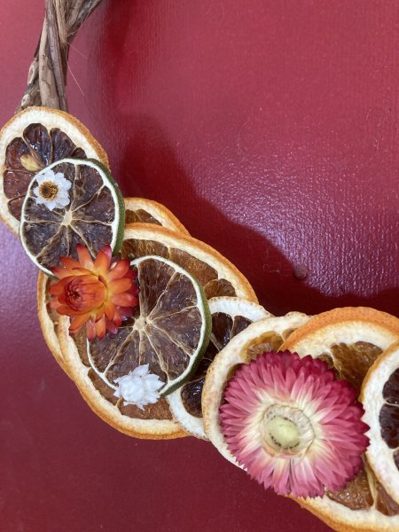 Locally harvested grapevine wreaths, loaded with all our flowers (grown from seed, dried with love). Every listing is unique to picture. This wreath measures approximately 10 inches in diameter and features dehydrated citrus